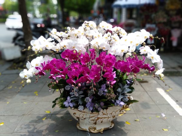 Chậu Lan K030 là chậu lan hồ điệp được kingflowers thiết kế hòa trộn đan xen giữa lan trắng và lan tím tạo điểm nhấn nổi bật.