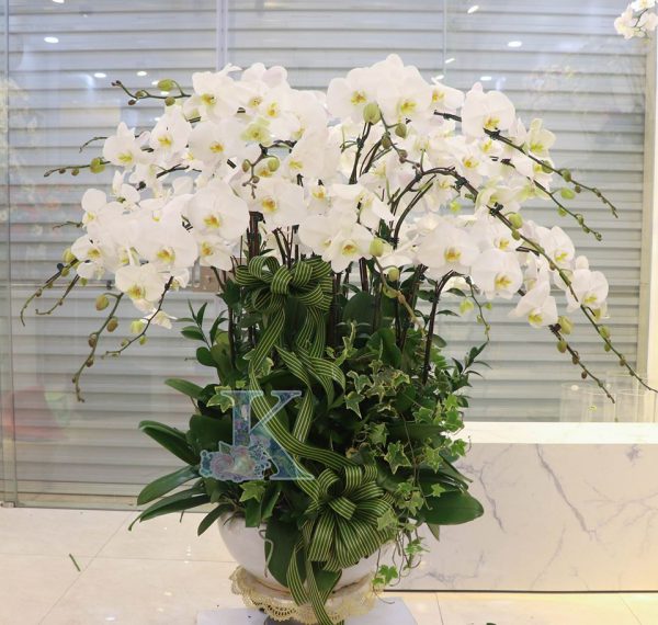 Chậu lan gồm 25 cành lan trắng tinh khôi, thuần khiết và vô cùng sang trọng. Trang trí tiểu cảnh, Phù hợp với không gian cao cấp như phòng khách, nhà hàng, khách sạn hay sảnh công ty,…