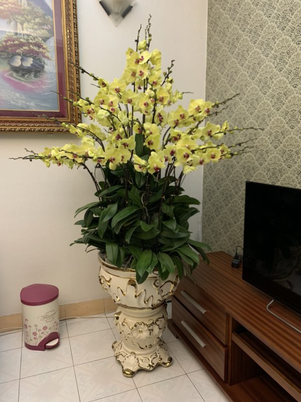 Chậu lan hồ điệp vàng tượng trưng cho may mắn và thịnh vượng. Bởi vậy nên rất được nhiều khách hàng lựa chọn để trang trí ngày Tết. Không những vậy nó còn được trang trí trong các hội nghị, sự kiện để tăng thêm vẻ sang trọng.